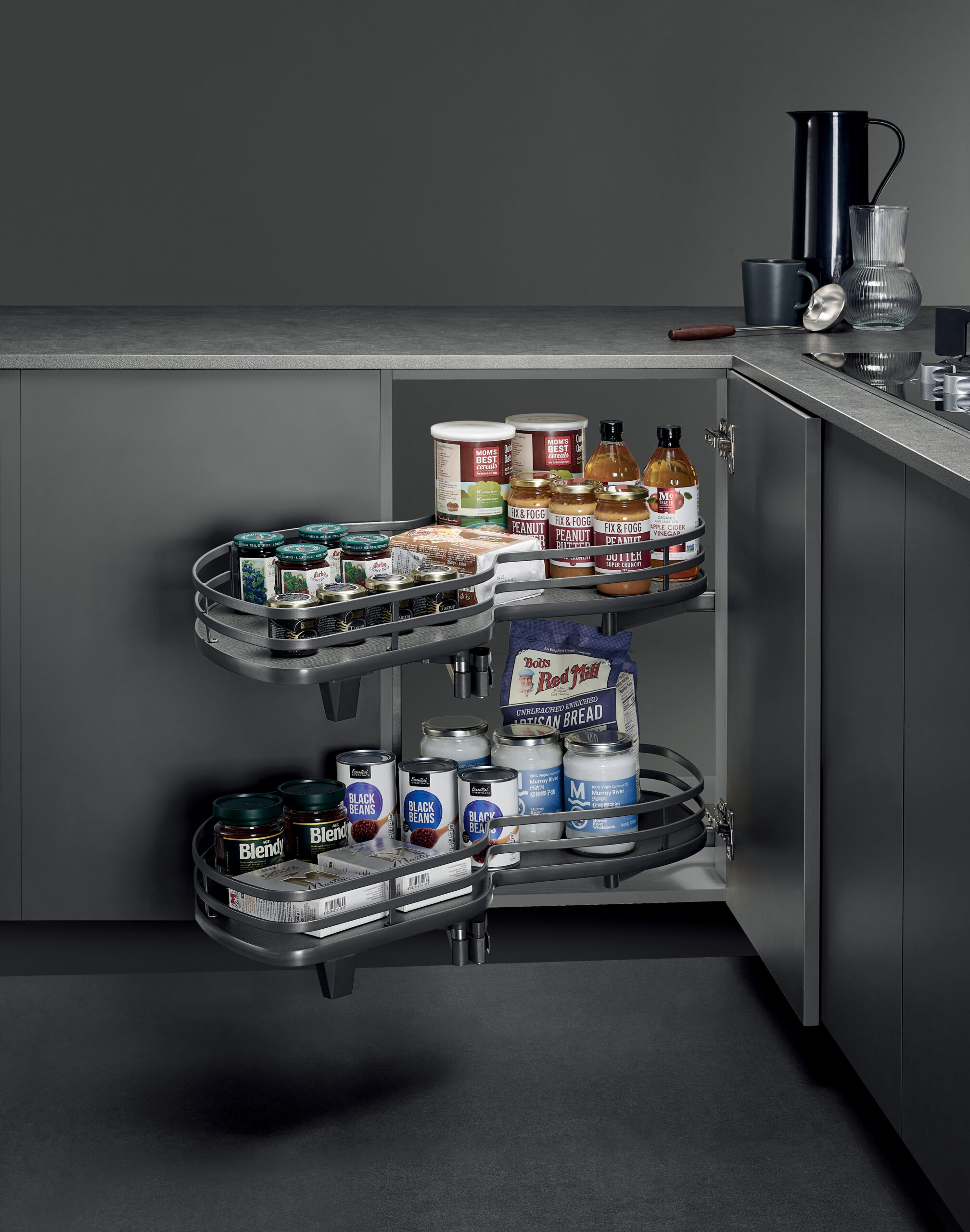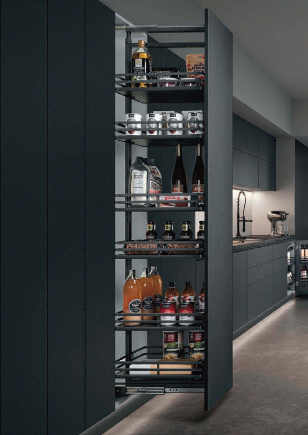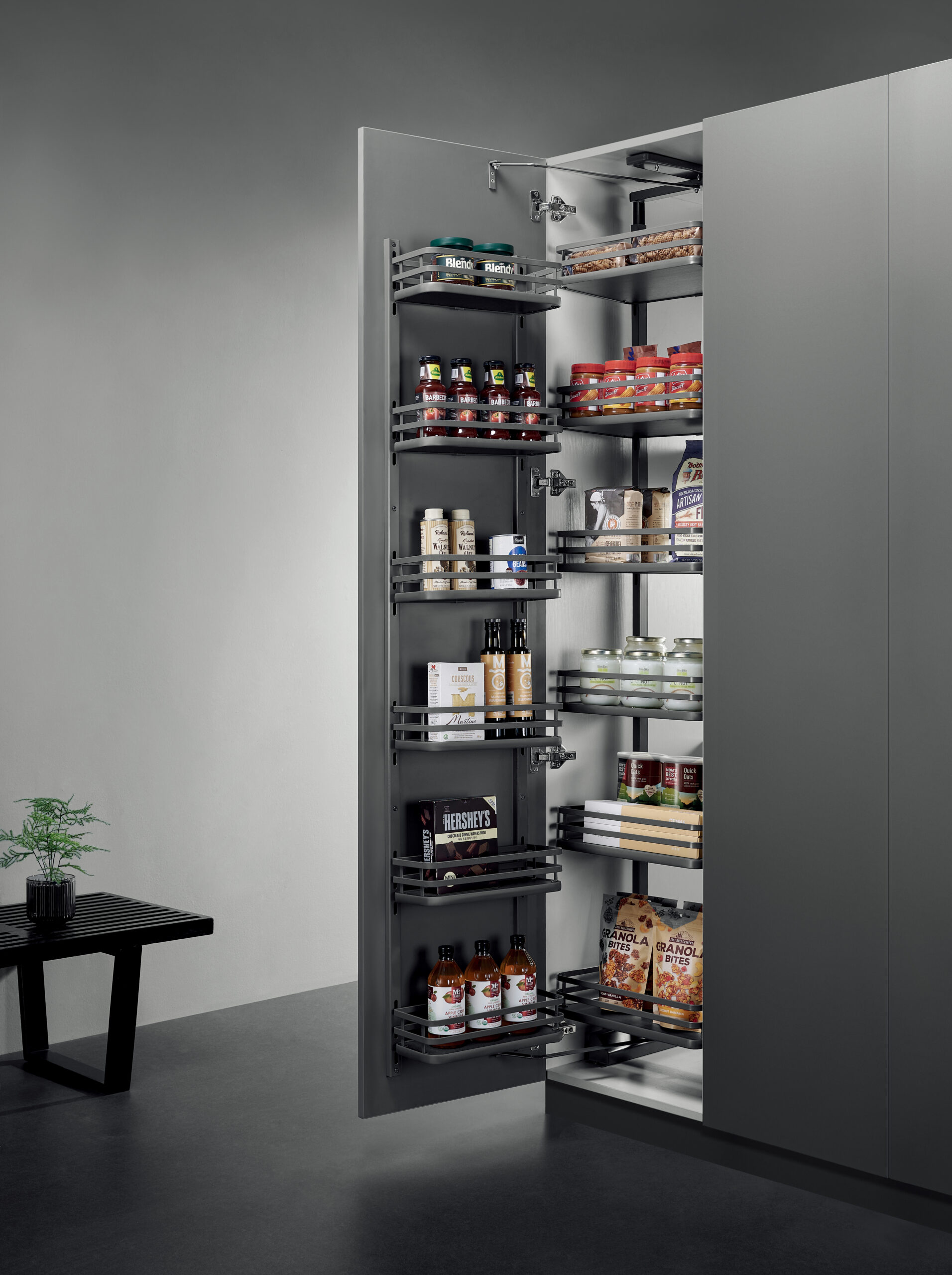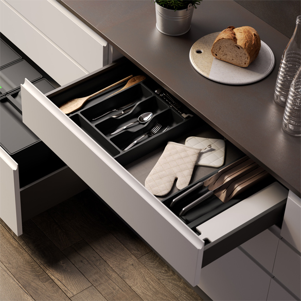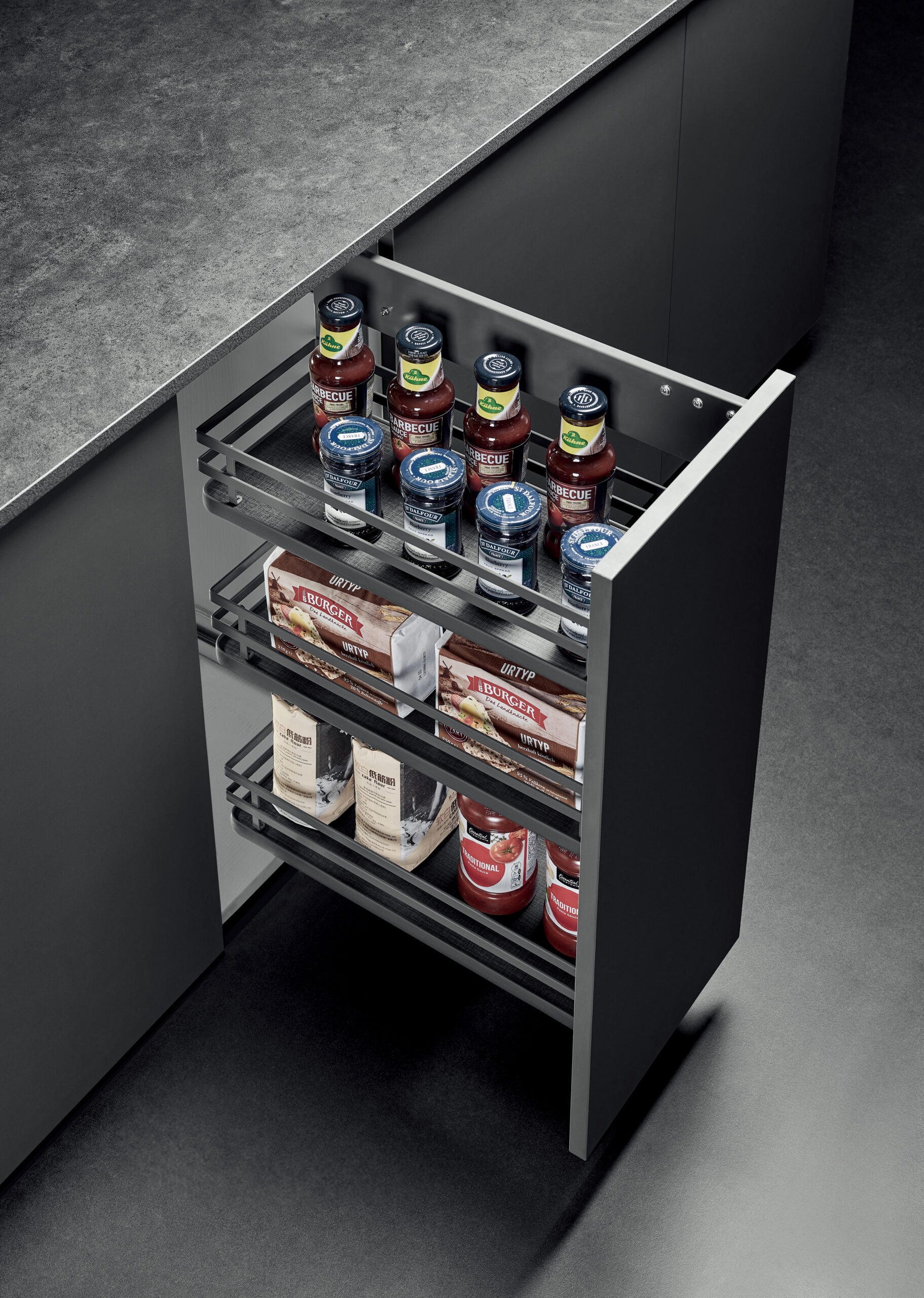 Magic corner, swing tray, τροφοθήκες, βαγονέτα, κουταλοθήκες, κάδοι απορριμάτων και τα αγαπημένα συρτάρια Slim Box – όλα διαθέσιμα σε ανθρακί απόχρωση – προσφέρουν μια ενιαία και κομψή λύση για κάθε σύνθεση κουζίνας.