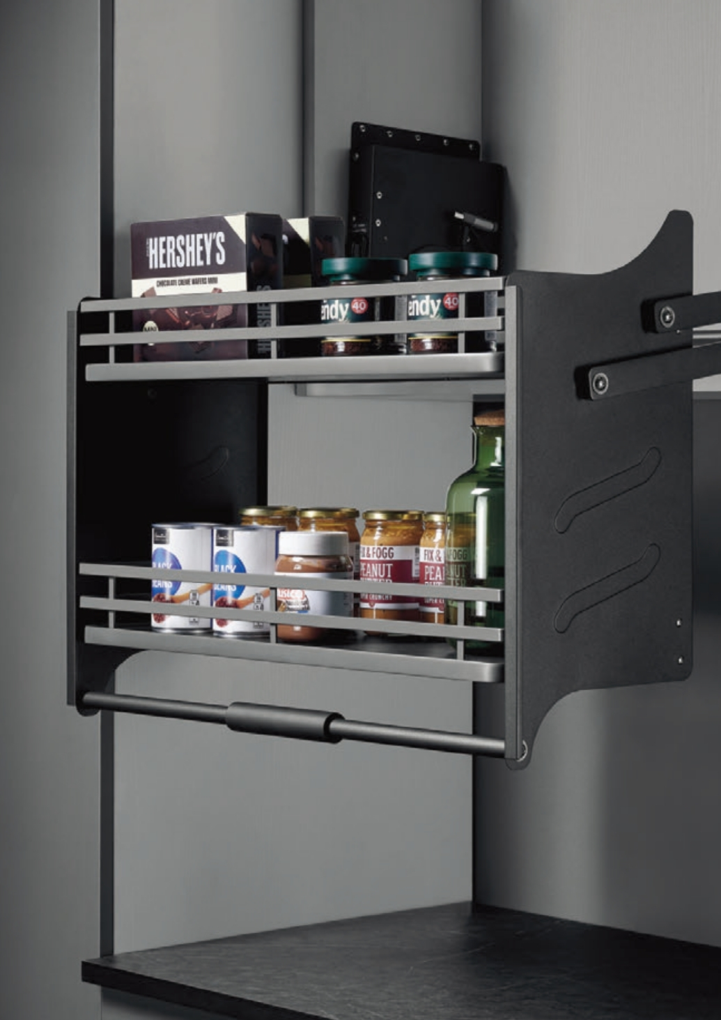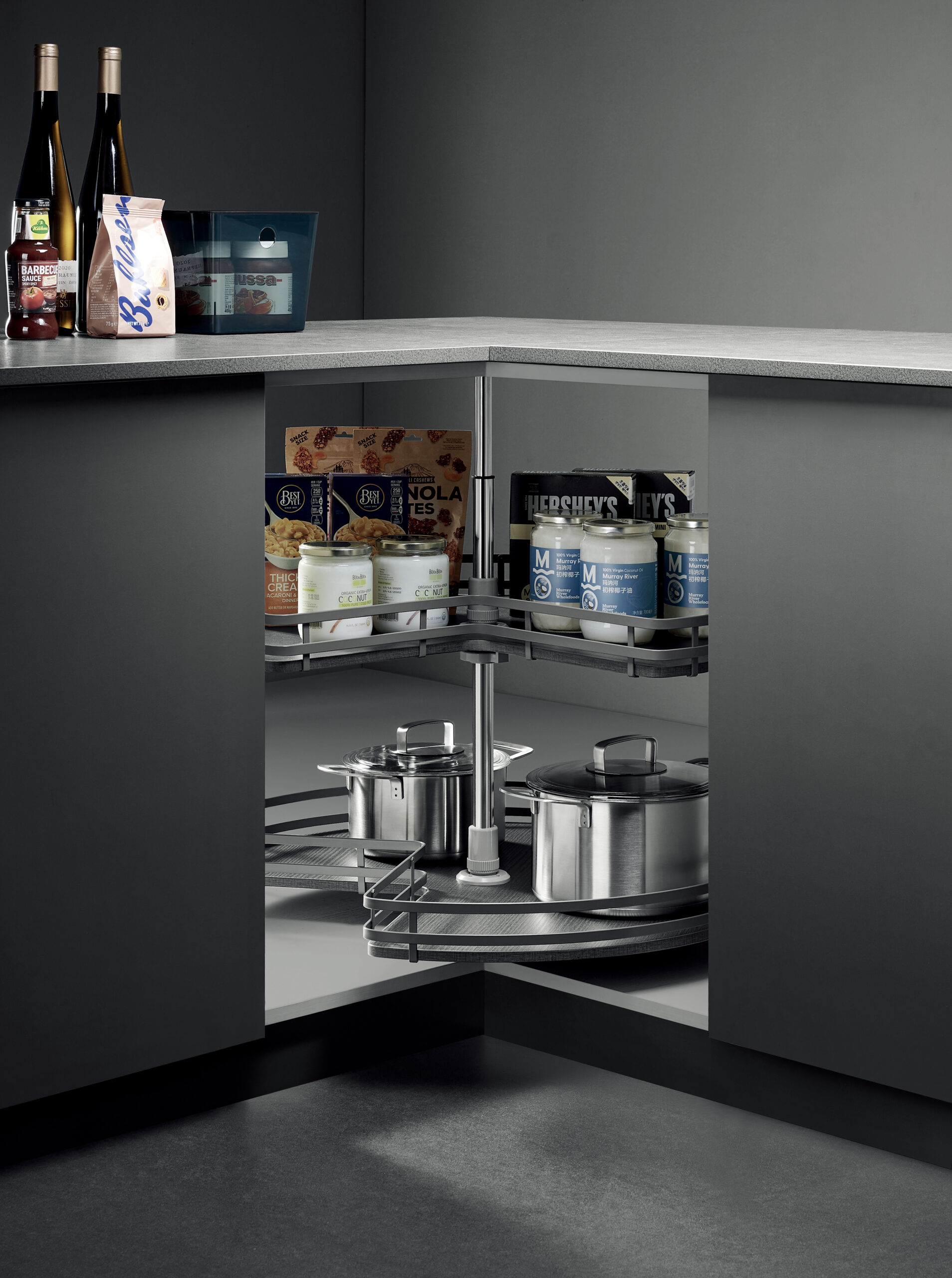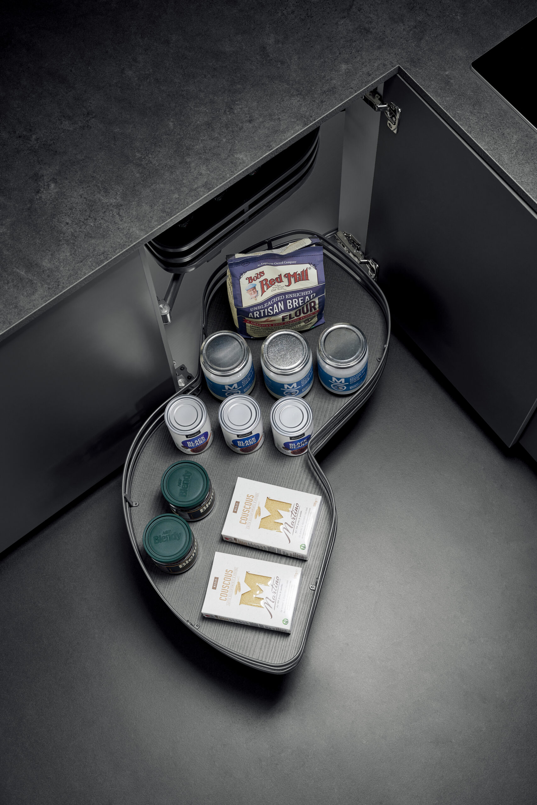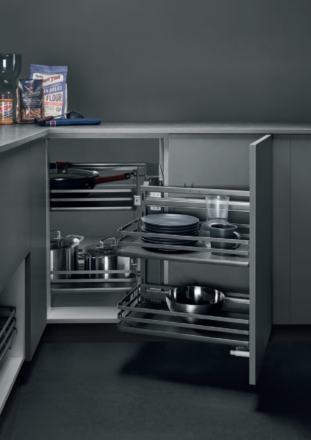 Magic corner, swing tray, τροφοθήκες, βαγονέτα, κουταλοθήκες, κάδοι απορριμάτων και τα αγαπημένα συρτάρια Slim Box – όλα διαθέσιμα σε ανθρακί απόχρωση – προσφέρουν μια ενιαία και κομψή λύση για κάθε σύνθεση κουζίνας.