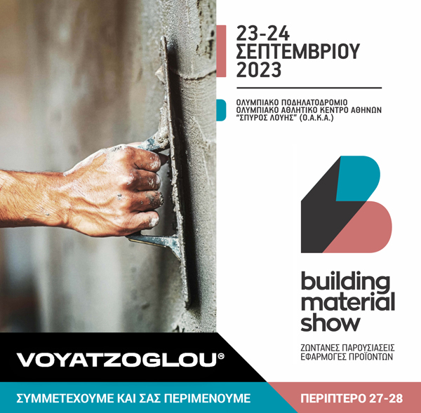 Η εταιρεία VOYATZOGLOU θα συμμετέχει στη διήμερη έκθεση Building Material Show 23 - 24 Σεπτεμβρίου 2023 που θα διεξαχθεί στο Ολυμπιακό Ποδηλατοδρόμιο (ΟΑΚΑ).